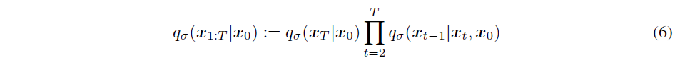 이때 Eq (4)에 의해 $q_\sigma (\mathbf{x}_T|\mathbf{x}_0) = \mathcal{N}(\sqrt{\alpha_T} \mathbf{x}0, (1-\alpha_T)\mathbf{I})$이고, 이를 이용하면 $\mathbf{x}{t-1}$을 $\mathbf{x}_t$와 $\mathbf{x}_0$로 다음과 같이 나타낼 수 있다. 이 과정에서 reparameterization trick이 사용되었다.